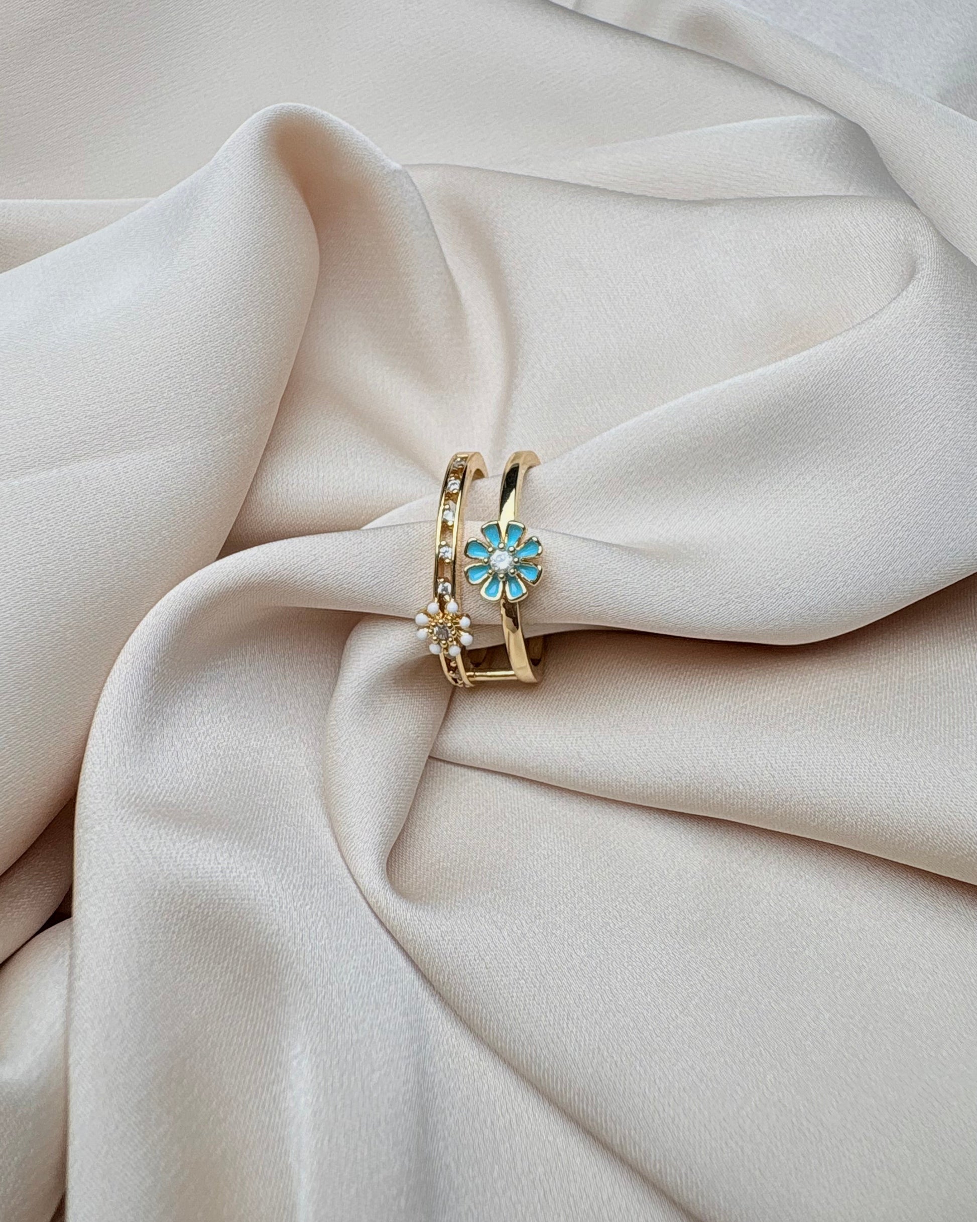 Bask in floral charm with the Petal Whimsy Duo — a delightful ring set that brings together soft turquoise enamel, dainty pearls, and radiant gold detailing. Inspired by garden dreams and sunshine days, this anti-tarnish, lightweight set is perfect for stacking or wearing solo. Whimsical, romantic, and effortlessly cute — your fingers just found their favourite bloom.